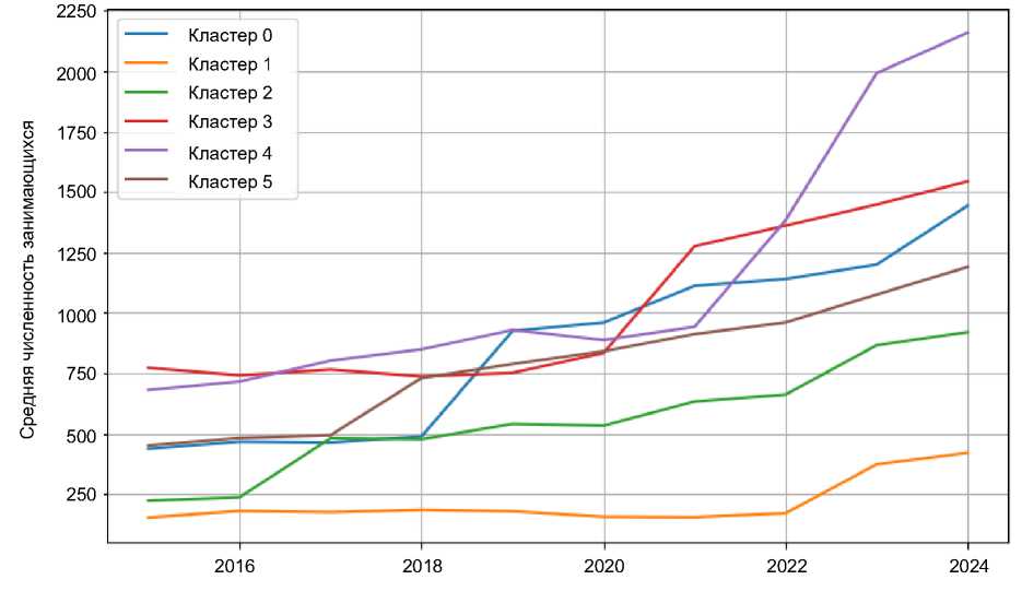 Обобщенные траектории динамики, соответствующие каждому из выделенных кластеров, представлены на рисунке 2. Линии центроидов отражают средние значения численности занимающихся по видам спорта, входящим в соответствующий кластер, и позволяют наглядно сопоставить различия в темпах и устойчивости роста.