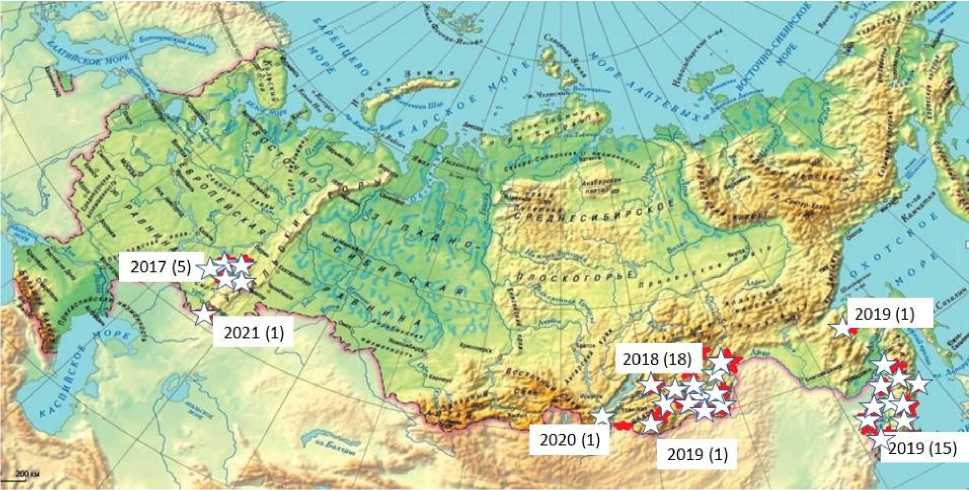 Эпизоотии ящура среди крупного рогатого скота зафиксированы в Башкирии (2017 г. – 5 э.о.), Забайкальском крае (2018 г. – 18 э.о.), Приморском крае (2019 г. – 15 э.о.), Хабаровском крае (2019 год – 2 э.о.) и в Оренбургской области (2021 г. – 2 э.о.) [9] (рис. 2).