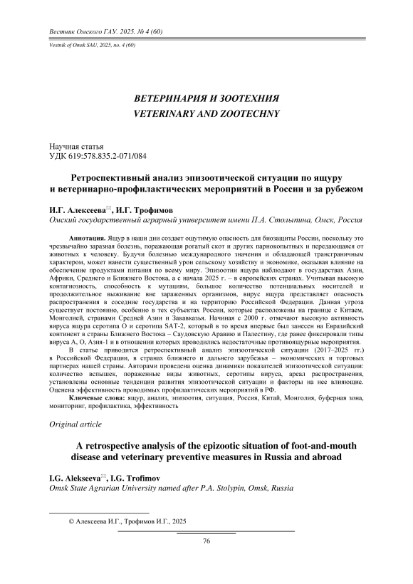 Ящур в наши дни создает ощутимую опасность для биозащиты России, поскольку это чрезвычайно заразная болезнь, поражающая рогатый скот и других парнокопытных и передающаяся от животных к человеку. Будучи болезнью международного значения и обладающей трансграничным характером, может нанести существенный урон сельскому хозяйству и экономике, оказывая влияние на обеспечение продуктами питания по всему миру. Эпизоотии ящура наблюдают в государствах Азии, Африки, Среднего и Ближнего Востока, а с начала 2025 г. – в европейских странах. Учитывая высокую контагиозность, способность к мутациям, большое количество потенциальных носителей и продолжительное выживание вне зараженных организмов, вирус ящура представляет опасность распространения в соседние государства и на территорию Российской Федерации. Данная угроза существует постоянно, особенно в тех субъектах России, которые расположены на границе с Китаем, Монголией, странами Средней Азии и Закавказья. Начиная с 2000 г. отмечают высокую активность вируса ящура серотипа О и серотипа SAT-2, который в то время впервые был занесен на Евразийский континент в страны Ближнего Востока – Саудовскую Аравию и Палестину, где ранее фиксировали типы вируса А, О, Азия-1 и в отношении которых проводились недостаточные противоящурные мероприятия. В статье приводится ретроспективный анализ эпизоотической ситуации (2017–2025 гг.) в Российской Федерации, в странах ближнего и дальнего зарубежья – экономических и торговых партнерах нашей страны. Авторами проведена оценка динамики показателей эпизоотической ситуации: количество вспышек, пораженные виды животных, серотипы вируса, ареал распространения, установлены основные тенденции развития эпизоотической ситуации и факторы на нее влияющие. Оценена эффективность проводимых профилактических мероприятий в РФ.