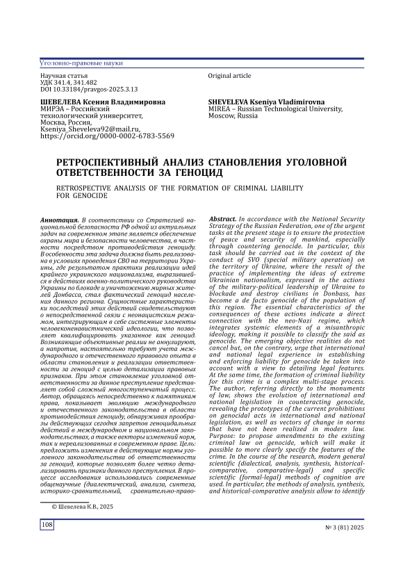 В соответствии со Стратегией национальной безопасности РФ одной из актуальных задач на современном этапе является обеспечение охраны мира и безопасности человечества, в частности посредством противодействия геноциду. В особенности эта задача должна быть реализована в условиях проведения СВО на территории Украины, где результатом практики реализации идей крайнего украинского национализма, выразившейся в действиях военно-политического руководства Украины по блокаде и уничтожению мирных жителей Донбасса, стал фактический геноцид населения данного региона. Сущностные характеристики последствий этих действий свидетельствуют о непосредственной связи с неонацистским режимом, интегрирующим в себе системные элементы человеконенавистнической идеологии, что позволяет квалифицировать указанное как геноцид. Возникающие объективные реалии не аннулируют, а напротив, настоятельно требуют учета международного и отечественного правового опыта в области становления и реализации ответственности за геноцид с целью детализации правовых признаков. При этом становление уголовной ответственности за данное преступление представляет собой сложный многоступенчатый процесс. Автор, обращаясь непосредственно к памятникам права, показывает эволюцию международного и отечественного законодательства в области противодействия геноциду, обнаруживая прообразы действующих сегодня запретов геноцидальных действий в международном и национальном законодательствах, а также векторы изменений норм, так и нереализованных в современном праве. Цель: предложить изменения в действующие нормы уголовного законодательства об ответственности за геноцид, которые позволят более четко детализировать признаки данного преступления. В процессе исследования использовались современные общенаучные (диалектический, анализа, синтеза, историко-сравнительный, сравнительно-правовой) и частнонаучные (формально-юридический) методы познания. В частности, методы анализа, синтеза и историко-сравнительный позволили определить предпосылки и факторы, обусловливающие криминализацию геноцида. Сравнительно-правовой метод способствовал изучению вопросов, связанных с уголовной ответственностью за геноцид в международном и национальном законодательствах. Формально-юридический метод позволил определить понятие и содержание дефиниции «культурный геноцид». Результаты: на основе последовательного изучения этапов становления уголовной ответственности за геноцид на международном и национальном уровнях выявлены особенности его определения, факторы, оказавшие влияние на современное понимание геноцида, предложены меры по устранению возникших ввиду неоднократного изменения сущностного содержания понятия «геноцид» ограничений, заключающихся в исключении ответственности за совершение культурного геноцида.