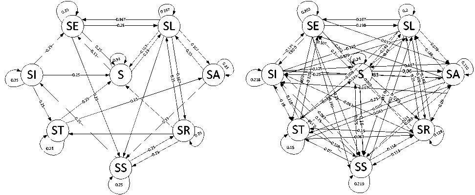Из SL: Возможны переходы в {S, SL, SS, SE, SA, SR} → 6 вариантов. P = 1/6 ≈ 0.167.