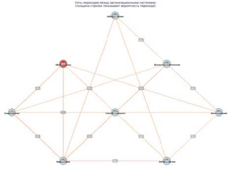 Реверсивно-переходные модели визуализированы ориентированным графом состояний (рис.1) типологии организационных и производственных систем, функции перехода реализованы путем создания матриц переходных вероятностей для каждого этапа эволюции.