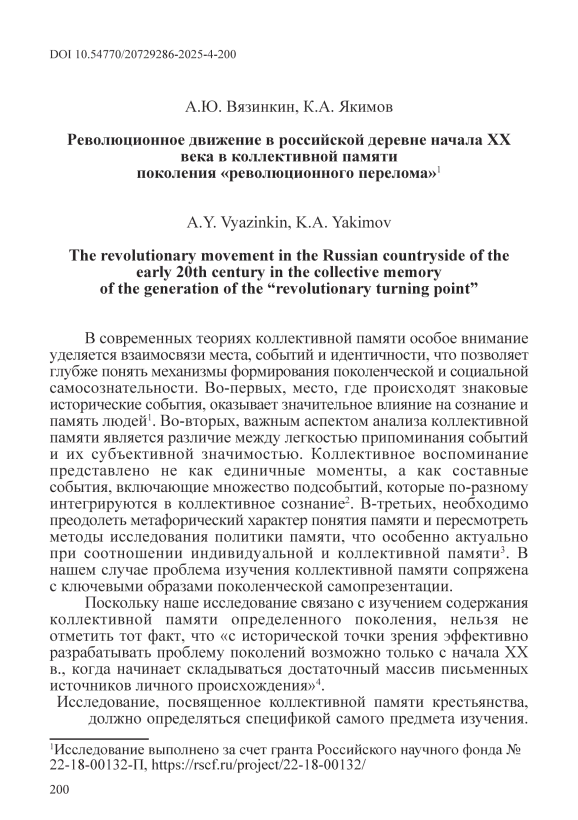 В статье на основе широкого пласта архивных документов впервые в отечественной историографии рассматривается коллективная память крестьян поколения «революционного перелома», что позволяет глубже понять роль крестьянского движения начала XX века, его участников и образы их революционной идентичности. Особое внимание уделяется вопросам восприятия революционных идей, роли сельских учителей и родственных связей в их пропаганде, а также участию крестьян в революционных акциях, таких как распространение нелегальной литературы, агитационная работа, участие в массовых протестных движениях и иных практиках сопротивления, в том числе насильственных. Важной частью исследования является выделение мотивов вовлечения в революционное движение, среди которых личные убеждения, желание перемен, сопротивление устоявшемуся порядку и поиск новых идей, а также влияние революционных идей, поступавших из города, на деревню, что впервые рассматривается в контексте их внутреннего восприятия и трансформации локальной социальной среды. Впервые в отечественной историографии анализируется специфика отражения в коллективной памяти поколения революционных практик на селе, включающая особенности методов борьбы, обусловленные аграрной спецификой и особым пространственным контекстом. В центре внимания – то, как революционные идеи формировали личностные сценарии, мировоззрение и поведенческие модели участников движения. Делается вывод, что события первой российской революции сыграли ключевую роль в радикализации сознания значительной части сельской молодежи, формировании нового мировоззрения и взглядов, существенно отличавшихся от традиционализма старших поколений российской деревни. Авторы приходят к выводу, что коллективная память изучаемого поколения отражает внутренние переживания, мотивы борьбы и личностные идеи, связанные с революционными практиками, что подчеркивает роль революции как источника личных вызовов, идей и активного участия в переменах, способствующих формированию их социальной идентичности.
