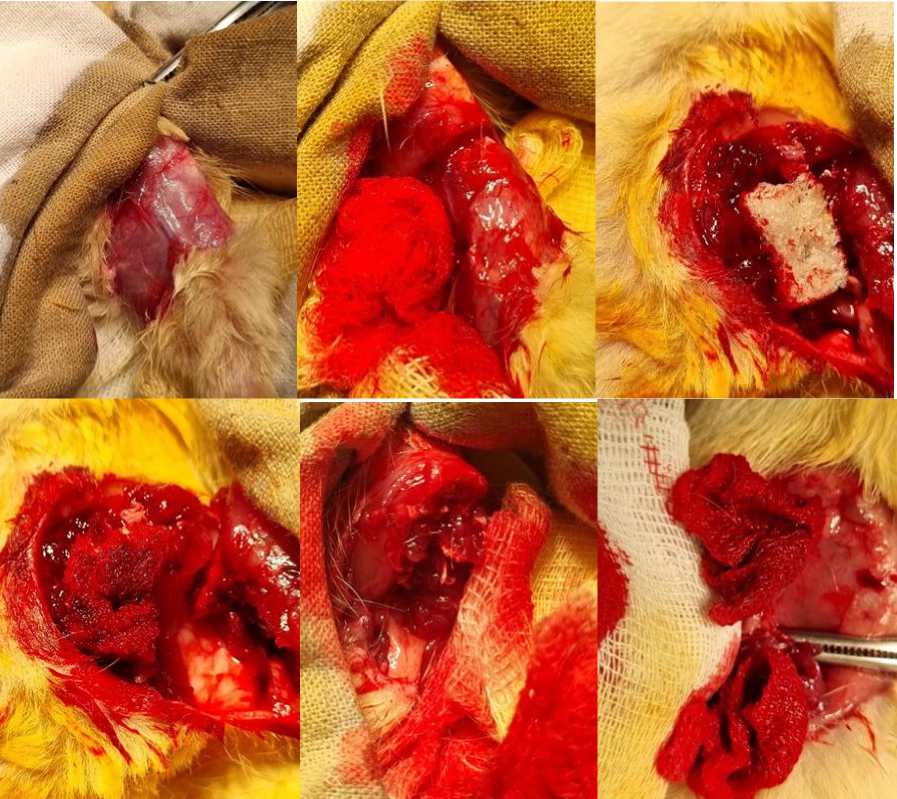 Накануне перед оперативным вмешательством крысы находились на голодной диете 6 часов. Под общей анестезией парами изофлюрана крысам контрольной группы выполнена ампутация левой нижней конечности на уровне средней трети бедра. Во время операции гемостаз из общей бедренной артерии и вены осуществлялся с использованием электрокоагулятора. При рассечении массива бедренных мышц и при пересечении бедренной кости кровотечение останавливалось путем прикладывания к кровоточащим тканям гемостатической коллагеновой губки (рис.1).