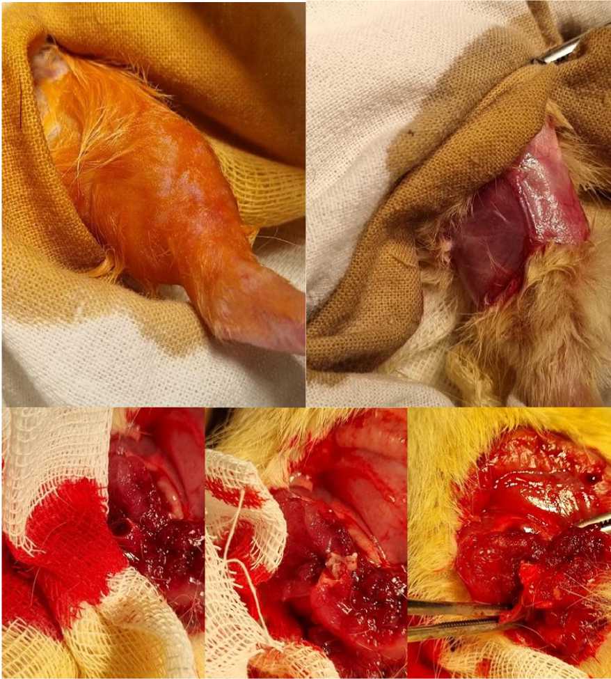 Аналогично животным контрольной группы, в опытной группе крыс, оперативные вмешательства выполнялись по прошествии 2 недель после индукции сахарного диабета и с условием повышения уровня глюкозы свыше 17ммоль/л, а также с учетом исключения из группы исследования ослабленных крыс. Таким образом из 20 крыс с индуцированным сахарным диабетом в опытную группу включены 14 крыс. Накануне перед оперативным вмешательством крысы находились на голодной диете 6 часов. Под общей анестезией парами изофлюрана крысам опытной группы выполнена ампутация левой нижней конечности на уровне с/3 бедра. Во время операции гемостаз из общей бедренной артерии и вены осуществлялся с использованием электрокоагулятора. При рассечении массива бедренных мышц и при пересечении бедренной кости кровотечение останавливалось путем использования порошка хемобен. Кровотечение из перикостальных сосудов и костномозгового канала осуществлялся с использованием пластичного геля, приготовленного по разработанной нами технологии (рис.2).