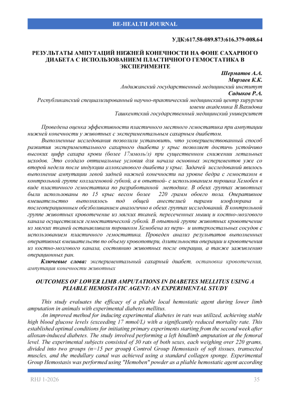 Eksperimental qandli diabeti bo‘lgan hayvonlarda pastki oyoq amputatsiyasi jarayonida mahalliy plastik gemostatik vositaning samaradorligini baholash. O‘tkazilgan tadqiqotlar natijasida aniqlandiki, kalamushlarda eksperimental qandli diabetni rivojlantirishning takomillashtirilgan usuli o‘lim ko‘rsatkichini sezilarli darajada kamaytirgan holda, qondagi qand miqdorining barqaror yuqori ko‘rsatkichlariga (17 mmol/l dan ortiq) erishish imkonini beradi. Bu esa kalamushlarda alloksanli diabet induksiyasidan keyin ikkinchi haftadanoq asosiy tajribalarni boshlash uchun optimal sharoit yaratdi. Tadqiqot vazifasi chap orqa oyoqni son darajasida amputatsiya qilish va gemostazni nazorat guruhida kollagen gubka bilan, tajriba guruhida esa ishlab chiqilgan uslub bo‘yicha "Hemoben" kukunidan plastik gemostatik ko‘rinishida foydalangan holda amalga oshirishdan iborat bo‘ldi. Har bir guruhda vazni 220 grammdan ortiq bo‘lgan, jinsi turlicha 15 tadan (jami 30 ta) kalamushda qo‘llanildi. Jarrohlik amaliyoti izoflyuran bug‘lari yordamida umumiy anesteziya ostida o‘tkazildi va operatsiyadan keyingi og‘riqsizlantirish choralari ikkala guruhda ham bir xil tartibda amalga oshirildi. Nazorat guruhidagi hayvonlarda yumshoq to‘qimalar, kesilgan mushaklar va suyak ko‘migi kanalidan qon ketishi gemostatik gubka yordamida to‘xtatildi. Tajriba guruhida esa yumshoq to‘qimalar hamda peri va interkostal tomirlardan qon ketishini to‘xtatish uchun plastik gemostatik shaklidagi Hemoben kukunidan foydalanildi. O‘tkazilgan jarrohlik amaliyotlari natijalari qon yo‘qotish hajmi, operatsiya davomiyligi, suyak ko‘migi kanalidan qon ketish vaqti, hayvonlarning operatsiyadan keyingi holati hamda operatsiya jarohatlarining bitishi bo‘yicha tahlil qilindi.