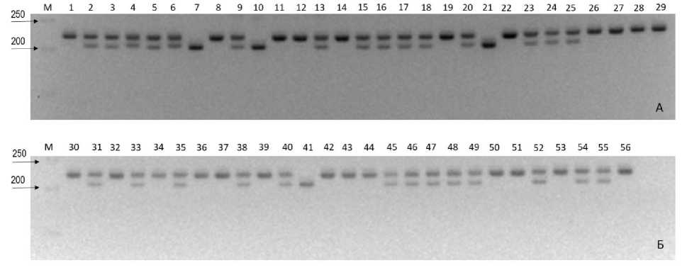 Рис. 1. Электрофоретический профиль сортов и гибридов F. × ananassa по маркеру FaOMT-SI/NO: М – маркер длин ДНК; A – электрофореграмма образцов 1–29; Б – электрофореграмма образцов 30–56; 1 – Акварель; 2 – Алтын; 3 – Амулет; 4 – Belrubi; 5 – Бова; 6 – Боровицкая;