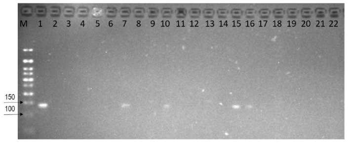 7 – Isaura; 8 – Karmen; 9 – Polka (отрицательный контроль); 10 – Salsa (положительный контроль); 11 – Sonsation; 12 – Алтын; 13 – Ассоль; 14 – Бова; 15 – Боровицкая; 16 – Даренка; 17 – Elsanta; 18 – Дуэт; 19 – Италмас; 20 – Альфа; 21 – Соловушка; 22 – Фейерверк Electrophoretic profile of strawberry varieties and hybrids using the FaFAD1 marker: M – DNA length marker; 1 – Akvarel', 2 – 2-54-11; 3 – 2-74-17; 4 – 85-18; 5 – Asia; 6 – Desna;