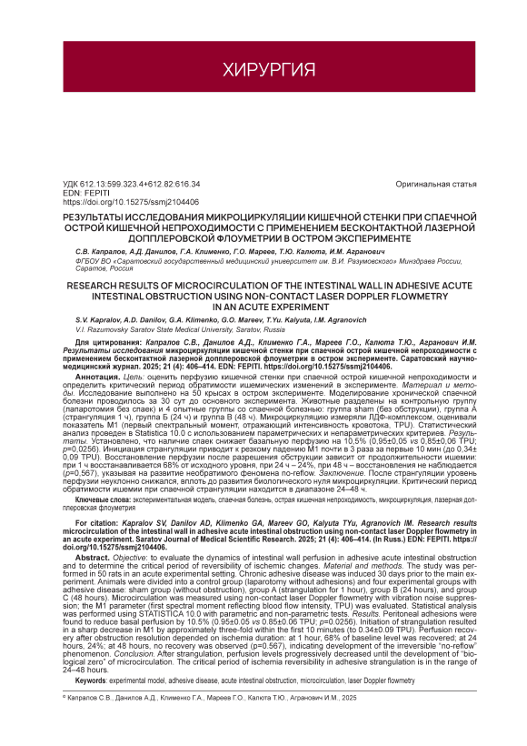 Цель: оценить перфузию кишечной стенки при спаечной острой кишечной непроходимости и определить критический период обратимости ишемических изменений в эксперименте. Материал и методы. Исследование выполнено на 50 крысах в остром эксперименте. Моделирование хронической спаечной болезни проводилось за 30 сут до основного эксперимента. Животные разделены на контрольную группу (лапаротомия без спаек) и 4 опытные группы со спаечной болезнью: группа sham (без обструкции), группа А (странгуляция 1 ч), группа Б (24 ч) и группа В (48 ч). Микроциркуляцию измеряли ЛДФ-комплексом, оценивали показатель М1 (первый спектральный момент, отражающий интенсивность кровотока, TPU). Статистический анализ проведен в Statistica 10.0 с использованием параметрических и непараметрических критериев. Результаты. Установлено, что наличие спаек снижает базальную перфузию на 10,5% (0,95±0,05 vs 0,85±0,06 TPU; p=0,0256). Инициация странгуляции приводит к резкому падению М1 почти в 3 раза за первые 10 мин (до 0,34± 0,09 TPU). Восстановление перфузии после разрешения обструкции зависит от продолжительности ишемии: при 1 ч восстанавливается 68% от исходного уровня, при 24 ч – 24%, при 48 ч – восстановления не наблюдается (p=0,567), указывая на развитие необратимого феномена no-reflow. Заключение. После странгуляции уровень перфузии неуклонно снижался, вплоть до развития биологического нуля микроциркуляции. Критический период обратимости ишемии при спаечной странгуляции находится в диапазоне 24–48 ч.