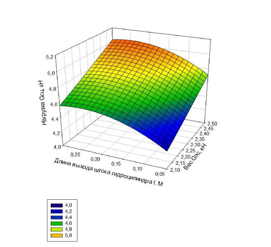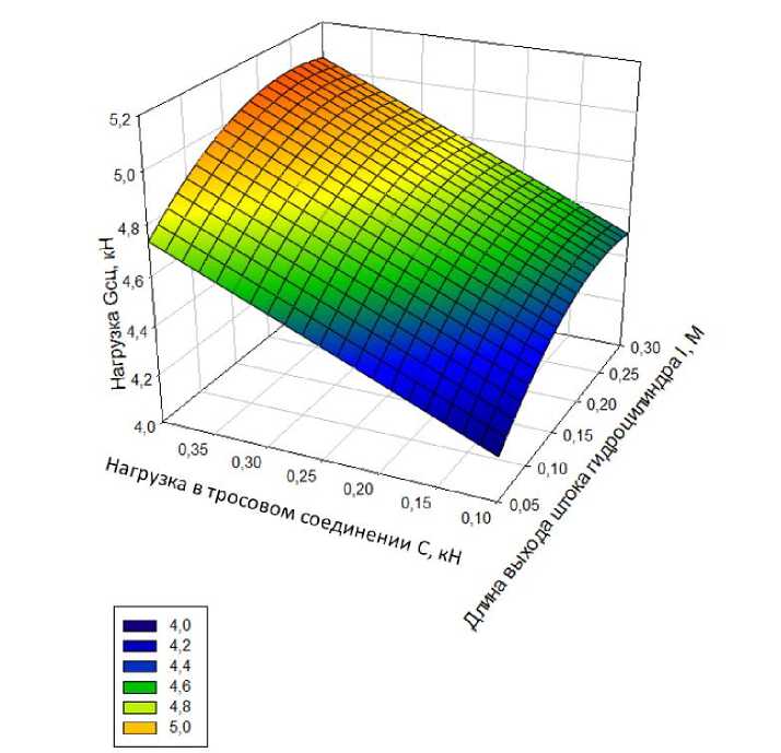 При заданном значении веса повышение силового воздействия органа прикатывающего агрегата происходит равномерно при увеличении нагрузки в тросовом соединении до 19% в заданном диапазоне активного эксперимента. Наряду с этим увеличение длины выхода штока гидроцилиндра позволяет достичь максимального значения искомой величины при значении l = 0,25м, дальнейшее движение штока не дает желаемого результата. Удельная нагрузка может увеличиться на 28% при оптимальном значении длины выхода штока гидроцилиндра.