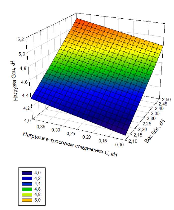 Рис. 3 . Взаимосвязь силового воздействия на прикатывающий агрегат от длины выхода штока гидроцилиндра и нагрузки в тросовом соединении (при G эс = 2,3 кН)