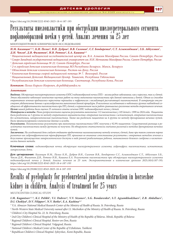 Результаты пиелопластики при обструкции пиелоуретерального сегмента подковообразной почки у детей. Анализ лечения за 25 лет