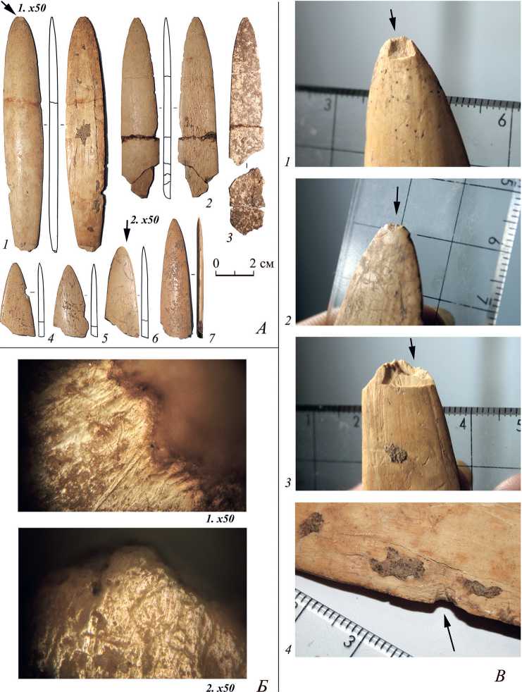 А: 1–7 – костяные наконечники и их обломки со следами метательного износа, стрелками указаны участки съемки микрофотографий; Б – микрофотографии боевых концов костяных наконечников со следами метательного износа в виде обволакивающей заполировки и серии направленных линейных следов, увеличение микрофотографии указано в кратах (х); В – макрофотографии следов метательного износа ( 1, 2 – повреждения боевых концов в форме плоских фасеток; 3 – ступенчатый слом черешковой части наконечника; 4 – выемка для фиксации наконечника и остатки, предположительно, клеящих составов на поверхности наконечника)