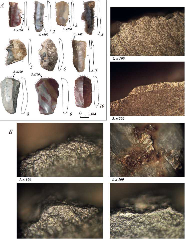 А : 1–6 – выемчатые орудия со следами обработки дерева и, вероятно, размягчения растительных волокон; 7 – морфологически выраженный резец со следами резания и скобления кости/рога; 8–10 – морфологически выраженные скребки со следами скобления (8, 9) и строгания (10) кости/рога; Б – микрофотографии следов износа на рабочих лезвиях кремневых орудий ( 1–3 – следы скобления кости/рога; 4 – остатки смолоподобных составов, предположительно, клея и растительных волокон на поверхности кремневого орудия для обработки дерева; 5, 6 – следы строгания дерева и, вероятно, размягчения растительных волокон)