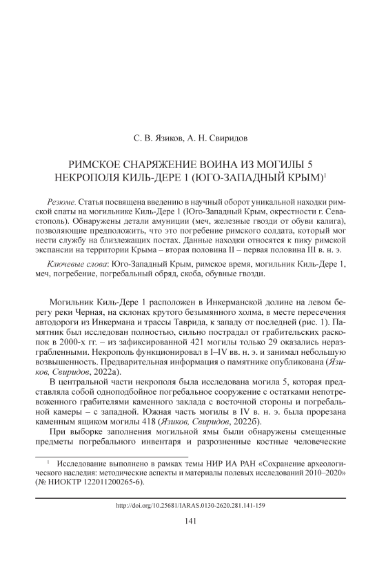 Статья посвящена введению в научный оборот уникальной находки римской спаты на могильнике Киль-Дере 1 (Юго-Западный Крым, окрестности г. Севастополь). Обнаружены детали амуниции (меч, железные гвозди от обуви калига), позволяющие предположить, что это погребение римского солдата, который мог нести службу на близлежащих постах. Данные находки относятся к пику римской экспансии на территории Крыма – вторая половина II – первая половина III в. н. э.