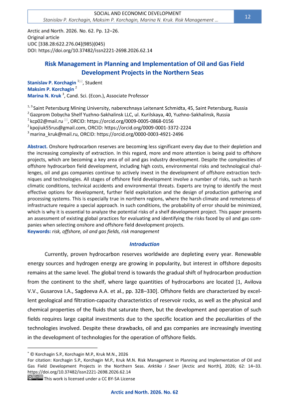 • identify and classify the key risks arising during the development of oil and gas fields in the northern seas, including socio-environmental, production-technological, economic, and geological aspects;