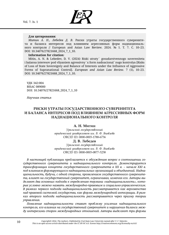 Текст статьи РИСКИ УТРАТЫ ГОСУДАРСТВЕННОГО СУВЕРЕНИТЕТА И БАЛАНСА ИНТЕРЕСОВ ПОД ВЛИЯНИЕМ АГРЕССИВНЫХ ФОРМ НАДНАЦИОНАЛЬНОГО КОНТРОЛЯ