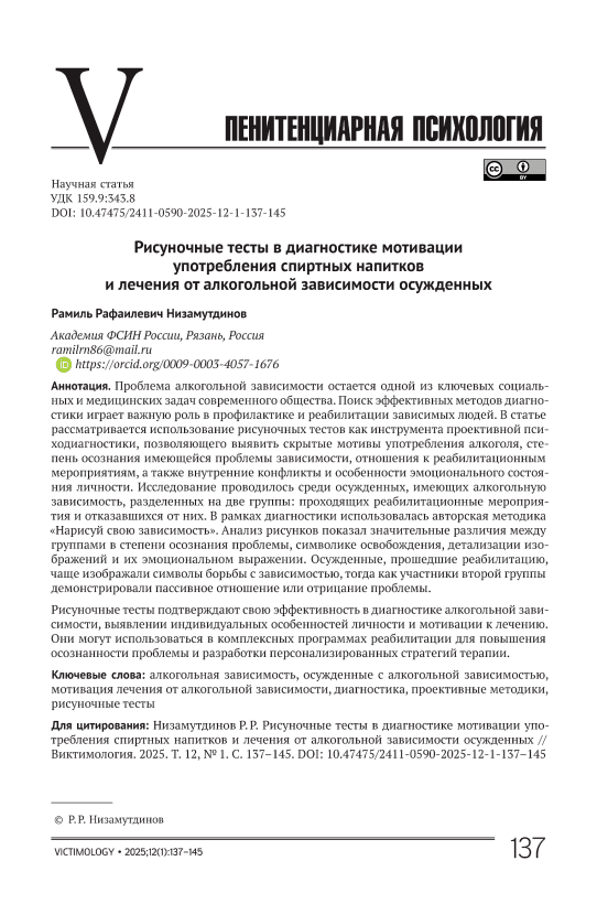 Проблема алкогольной зависимости остается одной из ключевых социальных и медицинских задач современного общества. Поиск эффективных методов диагностики играет важную роль в профилактике и реабилитации зависимых людей. В статье рассматривается использование рисуночных тестов как инструмента проективной психодиагностики, позволяющего выявить скрытые мотивы употребления алкоголя, степень осознания имеющейся проблемы зависимости, отношения к реабилитационным мероприятиям, а также внутренние конфликты и особенности эмоционального состояния личности. Исследование проводилось среди осужденных, имеющих алкогольную зависимость, разделенных на две группы: проходящих реабилитационные мероприятия и отказавшихся от них. В рамках диагностики использовалась авторская методика«Нарисуй свою зависимость». Анализ рисунков показал значительные различия между группами в степени осознания проблемы, символике освобождения, детализации изображений и их эмоциональном выражении. Осужденные, прошедшие реабилитацию, чаще изображали символы борьбы с зависимостью, тогда как участники второй группы демонстрировали пассивное отношение или отрицание проблемы. Рисуночные тесты подтверждают свою эффективность в диагностике алкогольной зависимости, выявлении индивидуальных особенностей личности и мотивации к лечению. Они могут использоваться в комплексных программах реабилитации для повышения осознанности проблемы и разработки персонализированных стратегий терапии.