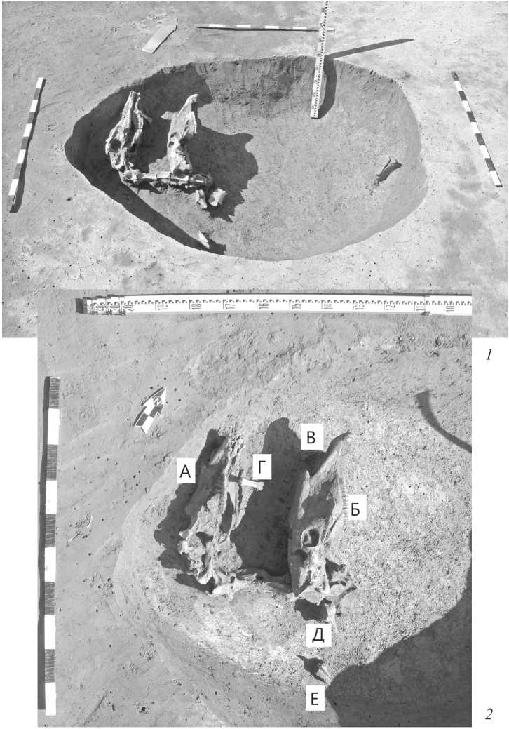 1 – вид с юга на захоронение лошадей; 2 – заполнение дна погребальной ямы ( А – череп жеребца с шестью шейными позвонками (особь 1); Б – череп кобылы (особь 2); В – луч сома; Г – правая пястная кость барана; Д – зимний рог оленя; Е – фрагменты лучевой и локтевой костей оленя, проксимальная их часть)