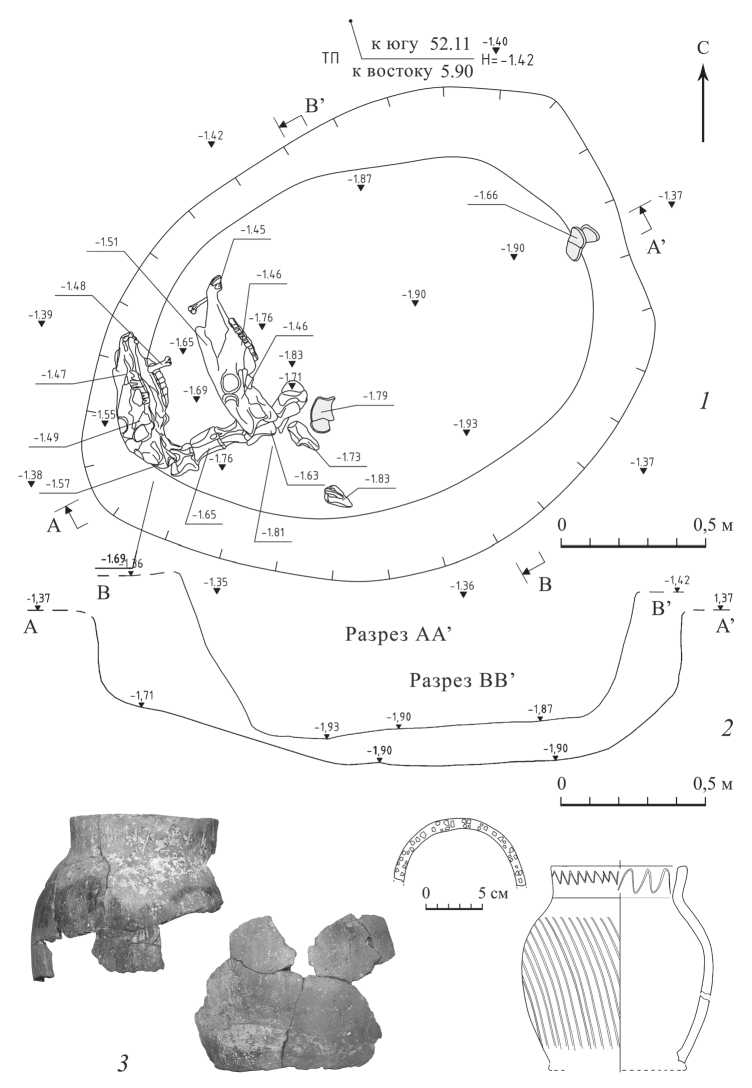 Исследованный археологический комплекс представляет собой округлую в плане и трапециевидную в разрезе яму размерами 2,1 × 1,7 м и глубиной не менее 1,1 м от пахотного слоя. Длинной осью ориентирована по линии СВ – ЮЗ, наклонные стенки плавно переходят в дно, которое выровнено в горизонтальной плоскости (рис. 3).