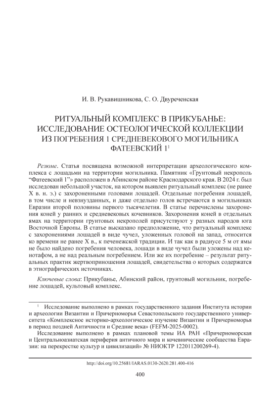 Статья посвящена возможной интерпретации археологического комплекса с лошадьми на территории могильника. Памятник «Грунтовый некрополь “Фатеевский 1”» расположен в Абинском районе Краснодарского края. В 2024 г. был исследован небольшой участок, на котором выявлен ритуальный комплекс (не ранее X в. н. э.) с захороненными головами лошадей. Отдельные погребения лошадей, в том числе и невзнузданных, и даже отдельно голов встречаются в могильниках Евразии второй половины первого тысячелетия. В статье перечислены захоронения коней у ранних и средневековых кочевников. Захоронения коней в отдельных ямах на территории грунтовых некрополей присутствуют у разных народов юга Восточной Европы. В статье высказано предположение, что ритуальный комплекс с захоронениями лошадей в виде чучел, уложенных головой на запад, относится ко времени не ранее X в., к печенежской традиции. И так как в радиусе 5 м от ямы не было найдено погребения человека, лошади в виде чучел были уложены над кенотафом, а не над реальным погребением. Или же их погребение – результат ритуальных практик жертвоприношения лошадей, свидетельства о которых содержатся в этнографических источниках.