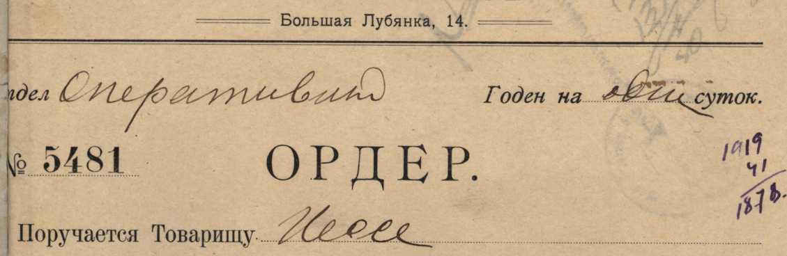24 июля 1919 г. по распоряжению А. И. Ротенберга был выписан ордер на обыск в квартире П. А. Ситникова (в документе записан год рождения хозяина – 1878 и его возраст – 41 год) (рис. 7)29.