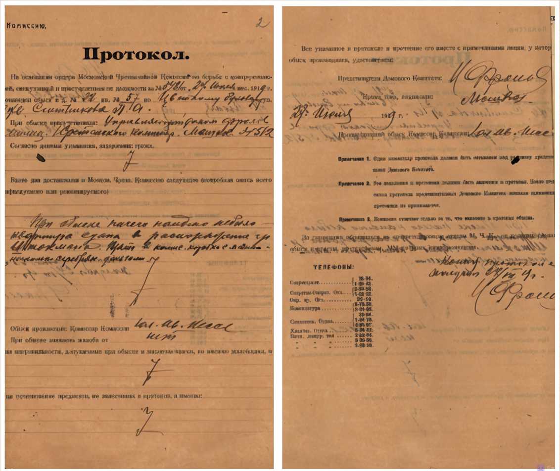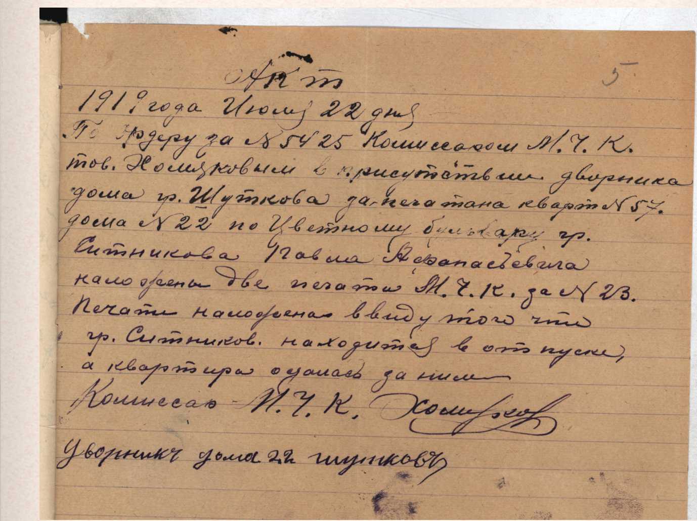 Из текста акта от 22 июля 1919 г. следует, что по ордеру за № 5425 известный комиссар МЧК И. М. Хомяков (меньше чем через год после этого погибший в перестрелке с грабителями) в присутствии дворника дома Шуткова опечатал его квартиру: «Печати наложены ввиду того, что гр. Ситников находится в отпуске, и квартира осталась за ним» (рис. 3)27.