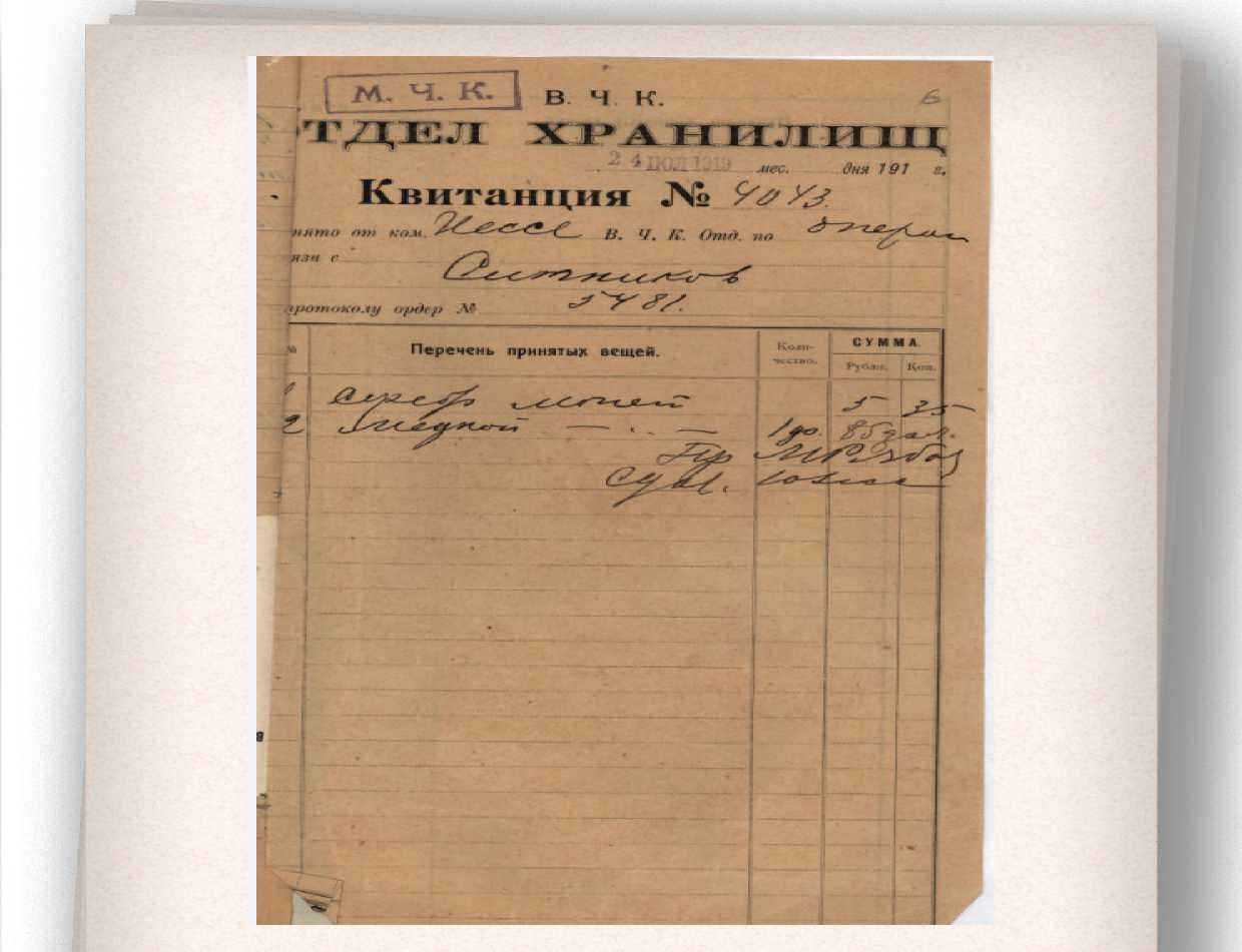 Р и с. 8. Квитанция Отдела хранилищ МЧК о принятии монет, изъятых из квартиры П. А. Ситникова