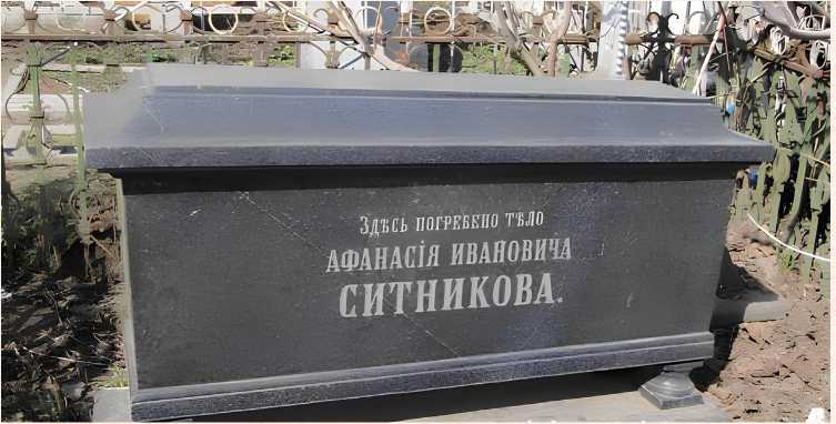 Родная сестра бабушки М. М. Бахтина Екатерины Павловны – Елизавета Павловна (1841– после 1891) – была замужем за купцом 2-й гильдии Афанасием Ивановичем Ситниковым (? – до 1891), могила которого – с массивным каменным надгробием в виде саркофага (вероятно, гранитным) – сохранилась на Троицком кладбище Орла (рис. 1). С. С. Конкин писал, что о нем ничего не известно, кроме того, что у него был сын Тихон [5]. Нам известны имена еще двух сыновей Елизаветы Павловны и Афанасия Ивановича – Сергей и Павел.