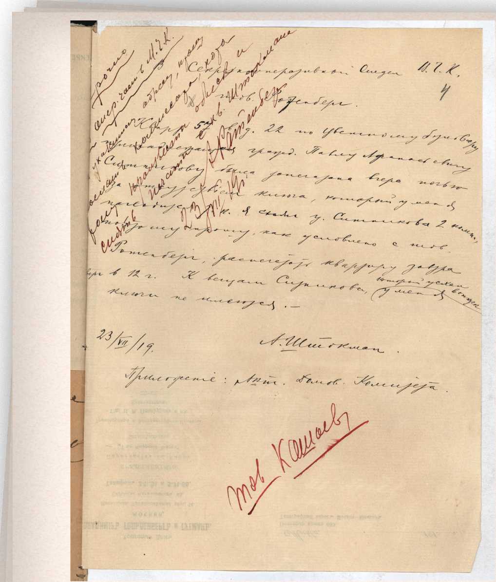 В квартире было несколько комнат, две из которых хозяин сдавал в аренду некоему А. Штокману, который обратился к начальнику следственной части отдела по борьбе с контрреволюцией Всероссийской чрезвычайной комиссии (ВЧК) А. И. Ротенбергу с заявлением, содержащим просьбу распечатать квартиру, чтобы он мог попасть в свои комнаты: «К вещам Ситникова, который уехал в отпуск, у меня ключи не имеются» (рис. 4); Ротенберг накладывает на заявление резолюцию с требованием произвести обыск и снять печати с комнат, арендуемых Штокманом (рис. 5, 6)28.