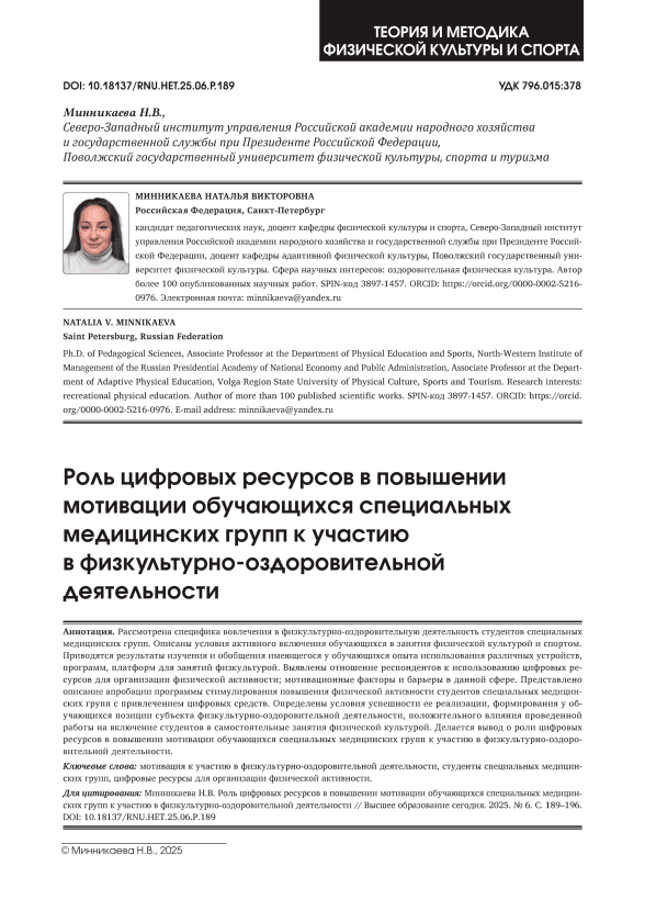 Рассмотрена специфика вовлечения в физкультурно-оздоровительную деятельность студентов специальных медицинских групп. Описаны условия активного включения обучающихся в занятия физической культурой и спортом. Приводятся результаты изучения и обобщения имеющегося у обучающихся опыта использования различных устройств, программ, платформ для занятий физкультурой. Выявлены отношение респондентов к использованию цифровых ресурсов для организации физической активности; мотивационные факторы и барьеры в данной сфере. Представлено описание апробации программы стимулирования повышения физической активности студентов специальных медицинских групп с привлечением цифровых средств. Определены условия успешности ее реализации, формирования у обучающихся позиции субъекта физкультурно-оздоровительной деятельности, положительного влияния проведенной работы на включение студентов в самостоятельные занятия физической культурой. Делается вывод о роли цифровых ресурсов в повышении мотивации обучающихся специальных медицинских групп к участию в физкультурно-оздоровительной деятельности.