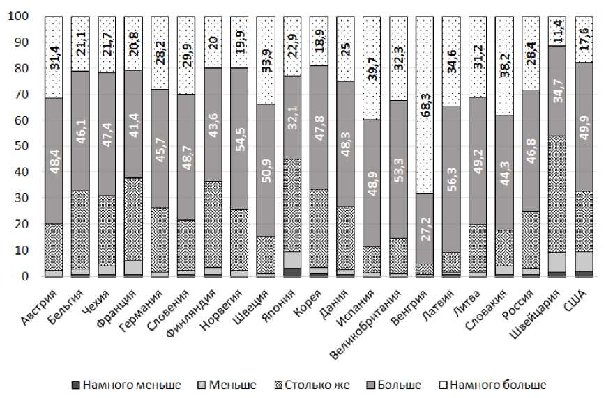 Во всех странах, кроме Швейцарии, большинство поддерживает увеличение госрасходов на здравоохранение (больше, намного больше) (рисунок 2). Поддержка особенно высока в Венгрии (96%), Латвии (91%), Испании (89%), Великобритании (86%), Швеции (85%), Словакии (83%), Литве (80%), Австрии (80%). Аналогичный высокий уровень наблюдается в Словении (79%), России (75%), Германии (74%), Норвегии (74%), Дании (73%) (т.е., в основном, в странах, относя- щихся к Типам 2, 3 и 4). Самый низкий уровень поддержки – в странах, принадлежащих к Типам 5 и 2 – Швейцарии (46%) и Японии (55%). Все остальные страны занимают промежуточное положение. В Швейцарии, Японии, Финляндии, Франции, Корее и Бельгии треть населения считает, что финансирование должно остаться прежним (30–45%). Доля тех, кто выступает за сокращение расходов, выше в США (10%), Швейцарии и Японии (по 9%), и Франции (6%).