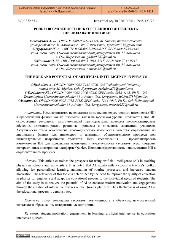 Современное образование переживает этап глубоких преобразований, связанных с активным внедрением цифровых технологий и развитием искусственного интеллекта (ИИ). Искусственный интеллект постепенно становится неотъемлемой частью учебного процесса, расширяя возможности преподавателей и создавая новые формы взаимодействия учащихся с учебным материалом. Одной из дисциплин, в которой потенциал ИИ проявляется особенно ярко, является физика — наука, требующая не только теоретического понимания, но и способности применять знания в практических и исследовательских ситуациях. Использование ИИ в преподавании физики открывает широкие перспективы: от автоматизированного анализа экспериментальных данных и моделирования сложных физических процессов до персонализации обучения и формирования адаптивных образовательных траекторий. Интеллектуальные системы способны облегчить труд преподавателя, повысить мотивацию студентов и сделать изучение физики более наглядным и доступным. В то же время внедрение ИИ ставит ряд методических, технических и этических вопросов, требующих внимательного рассмотрения. Актуальность исследования роли и возможностей искусственного интеллекта в преподавании физики обусловлена необходимостью повышения качества образования, поиска новых педагогических подходов и адаптации учебного процесса к условиям цифровой среды. Анализ потенциала ИИ позволяет не только определить направления его эффективного применения, но и выявить ограничения и риски, связанные с его интеграцией в образовательную практику. Считается, что формирование учебной мотивации в большей степени возложено на преподавателя. Чтобы вовлечь студентов в изучение дисциплины и заинтересовать их, он может использовать инновационные методы обучения с применением информационных технологий, игровых и интерактивных форм [1, 2].