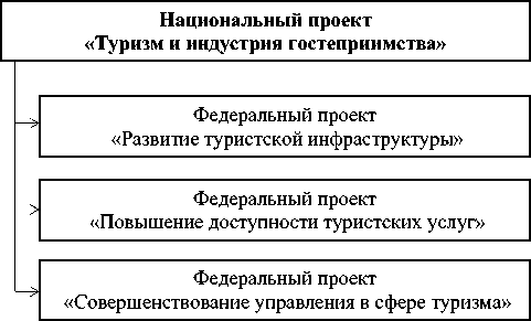 Российской Федерации частично были заложены в ФЦП «Развитие внутреннего и въездного туризма в Российской Федерации (2019–2025 годы)». Однако данная программа не была реализована, и на ее смену пришел Национальный проект «Туризм и индустрия гостеприимства», который нацелен на комплексное развитие отрасли туризма в России. Данный Национальный проект должен способствовать созданию условий для удобных, безопасных и интересных путешествий по стране [5]. В Национальный проект «Туризм и индустрия гостеприимства» входят три федеральных проекта, представленные на рисунке 1.