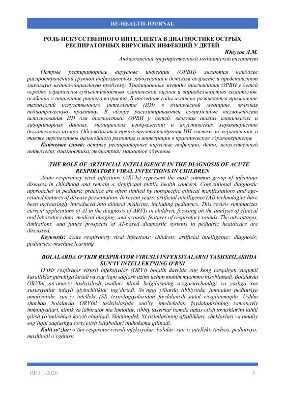Острые респираторные вирусные инфекции (ОРВИ) являются наиболее распространённой группой инфекционных заболеваний в детском возрасте и представляют значимую медико-социальную проблему. Традиционные методы диагностики ОРВИ у детей нередко ограничены субъективностью клинической оценки и вариабельностью симптомов, особенно у пациентов раннего возраста. В последние годы активно развивается применение технологий искусственного интеллекта (ИИ) в клинической медицине, включая педиатрическую практику. В обзоре рассматриваются современные возможности использования ИИ для диагностики ОРВИ у детей, включая анализ клинических и лабораторных данных, медицинских изображений и акустических характеристик дыхательных шумов. Обсуждаются преимущества внедрения ИИ-систем, их ограничения, а также перспективы дальнейшего развития и интеграции в практическое здравоохранение.