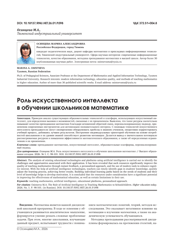 Анализ научной литературы позволяет обосновать актуальность статьи , определяющуюся наличием противоречия между необходимостью поиска новых персонализированных подходов в обучении математике современных школьников и отсутствием эффективных методов удовлетворения индивидуальных потребностей обучающихся с учетом уровня знаний каждого и темпов усвоения учебного материала. В условиях стремительного развития цифровых технологий исследователи рассматривают использование ИИ как ключевое направление для решения многих образовательных задач. В этих условиях необходимо научно обоснованное понимание вызовов и возможностей, связанных с применением ИИ в разви-