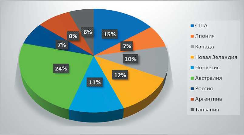 Рис. 1. Структура посещений нацпарков России и других странах мира за 2024 г. (составлено автором на основе международных сайтов национальных парков)