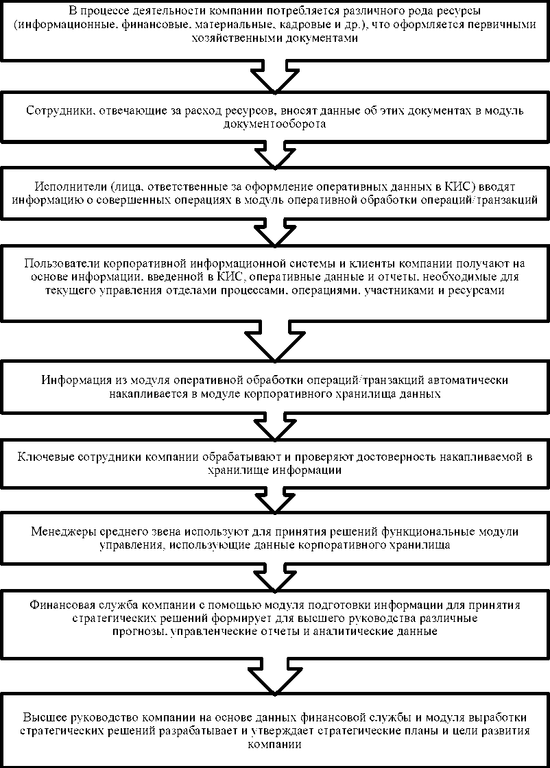 В эффективно спроектированных КИС информационные потоки перемещаются от оперативного уровня к стратегическому (снизу вверх). Алгоритм формирования информационных потоков в корпоративных системах может быть визуализирован в виде схемы, представленной на рисунке 2.1