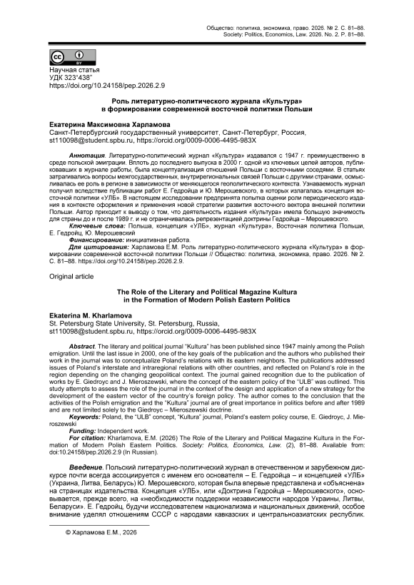The literary and political journal “Kultura” has been published since 1947 mainly among the Polish emigration. Until the last issue in 2000, one of the key goals of the publication and the authors who published their work in the journal was to conceptualize Poland’s relations with its eastern neighbors. The publications addressed issues of Poland’s interstate and intraregional relations with other countries, and reflected on Poland’s role in the region depending on the changing geopolitical context. The journal gained recognition due to the publication of works by E. Giedroyc and J. Mieroszewski, where the concept of the eastern policy of the “ULB” was outlined. This study attempts to assess the role of the journal in the context of the design and application of a new strategy for the development of the eastern vector of the country’s foreign policy. The author comes to the conclusion that the activities of the Polish emigration and the “Kultura” journal are of great importance in politics before and after 1989 and are not limited solely to the Giedroyc – Mieroszewski doctrine.