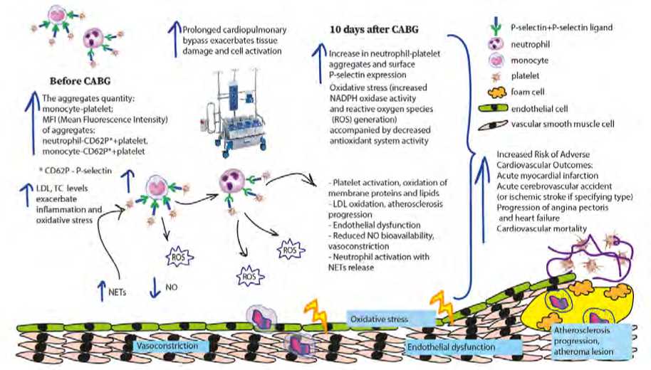 Note: CABG – coronary artery bypass grafting, CPB – cardiopulmonary bypass, ROS – reactive oxygen species, TC – total cholesterol, LDL – low-density lipoproteins, NO – nitric oxide, NETs – neutrophil extracellular traps, NADPH oxidase – nicotinamide adenine dinucleotide phosphate oxidase.