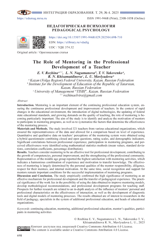 Введение. Наставничество – важный элемент системы дополнительного профессионального образования, обеспечивающий непрерывное профессиональное развитие и совершенствование педагога. В условиях стремительных изменений в образовательной среде, внедрения цифровых технологий, обновления федеральных государственных образовательных стандартов и растущих требований к качеству преподавания роль наставничества становится особенно важной. Цель исследования – выявить и проанализировать мотивацию учителей к участию в программах наставничества, а также систематизировать факторы, определяющие эффективность данного процесса. Материалы и методы. В исследовании приняли участие 321 чел. из различных образовательных организаций, что обеспечило репрезентативность данных и позволило провести сравнение по уровню опыта. Количественные и качественные данные о восприятии педагогами системы наставничества были получены с помощью гибридной анкеты, сочетающей закрытые и открытые вопросы, оценочные шкалы и демографические показатели. Значимые корреляции между профессиональным опытом, участием в программах наставничества и воспринимаемой эффективностью выявлялись с применением методов математической статистики (средние значения, стандартные отклонения, коэффициенты корреляции и процентное распределение). Результаты исследования. Педагоги считают наставничество эффективным инструментом профессионального развития, способствующим росту компетенций, личностному совершенствованию и укреплению профессионального сообщества. Наибольшую удовлетворенность от наставнической деятельности отметили представители средней возрастной группы, что свидетельствует о гармоничном сочетании опыта и мотивации к передаче знаний. Эффективность данного процесса определяется личными качествами руководителя – ответственностью, трудолюбием, уважением к своим подопечным и внутренней мотивацией. При этом их социальное признание и поддержка остаются важными условиями для успешной реализации программ наставничества. Обсуждение и заключение. Проведенное исследование позволило эмпирически подтвердить высокую значимость наставничества как эффективного механизма профессионального развития и передачи педагогического опыта. Практическая значимость работы заключается в возможности использования полученных данных для совершенствования моделей, разработки методических рекомендаций и программ профессионального развития преподавательского состава. Перспективы дальнейших исследований связаны с углубленным анализом влияния личностных и профессиональных характеристик наставников на эффективность взаимодействия, а также с разработкой диагностических инструментов и цифровых моделей процессов наставничества. Полученные результаты представляют интерес для исследователей в области педагогики, специалистов системы дополнительного профессионального образования и руководителей образовательных организаций.