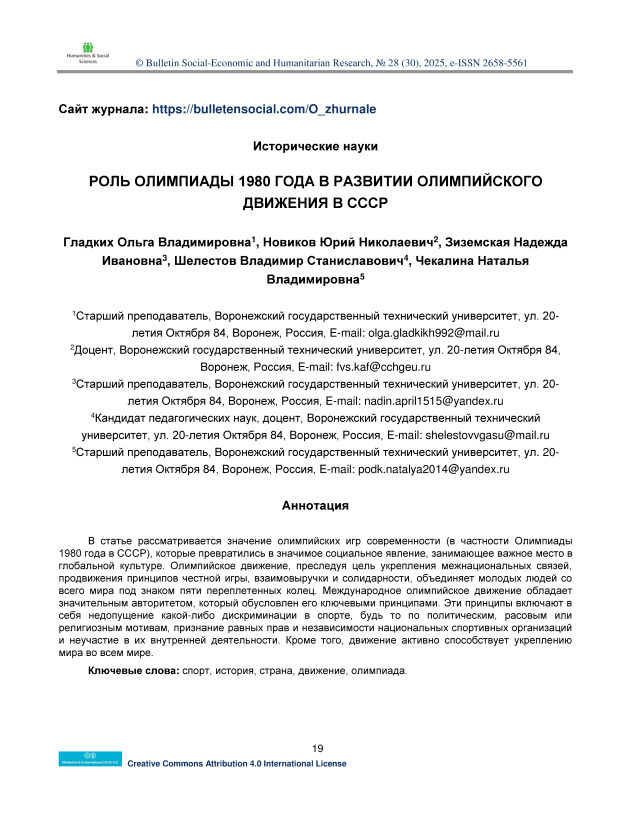 В статье рассматривается значение олимпийских игр современности (в частности Олимпиады 1980 года в СССР), которые превратились в значимое социальное явление, занимающее важное место в глобальной культуре. Олимпийское движение, преследуя цель укрепления межнациональных связей, продвижения принципов честной игры, взаимовыручки и солидарности, объединяет молодых людей со всего мира под знаком пяти переплетенных колец. Международное олимпийское движение обладает значительным авторитетом, который обусловлен его ключевыми принципами. Эти принципы включают в себя недопущение какой-либо дискриминации в спорте, будь то по политическим, расовым или религиозным мотивам, признание равных прав и независимости национальных спортивных организаций и неучастие в их внутренней деятельности. Кроме того, движение активно способствует укреплению мира во всем мире.