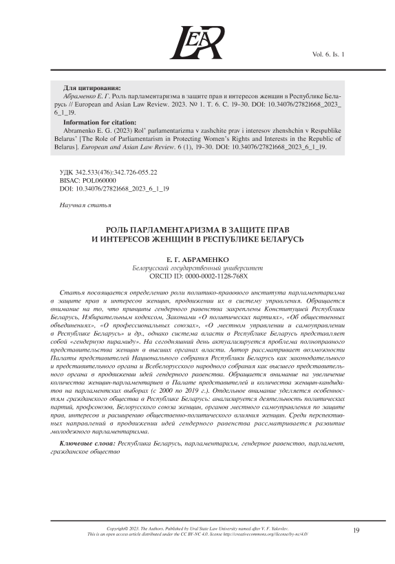 IDR: 14134894 | УДК: 342.533(476):342.726-055.22 | DOI: 10.34076/27821668_2023_6_1_19