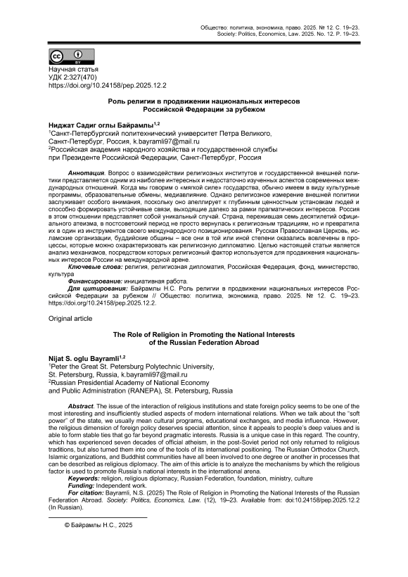 Вопрос о взаимодействии религиозных институтов и государственной внешней политики представляется одним из наиболее интересных и недостаточно изученных аспектов современных международных отношений. Когда мы говорим о «мягкой силе» государства, обычно имеем в виду культурные программы, образовательные обмены, медиавлияние. Однако религиозное измерение внешней политики заслуживает особого внимания, поскольку оно апеллирует к глубинным ценностным установкам людей и способно формировать устойчивые связи, выходящие далеко за рамки прагматических интересов. Россия в этом отношении представляет собой уникальный случай. Страна, пережившая семь десятилетий официального атеизма, в постсоветский период не просто вернулась к религиозным традициям, но и превратила их в один из инструментов своего международного позиционирования. Русская Православная Церковь, исламские организации, буддийские общины ‒ все они в той или иной степени оказались вовлечены в процессы, которые можно охарактеризовать как религиозную дипломатию. Целью настоящей статьи является анализ механизмов, посредством которых религиозный фактор используется для продвижения национальных интересов России на международной арене.