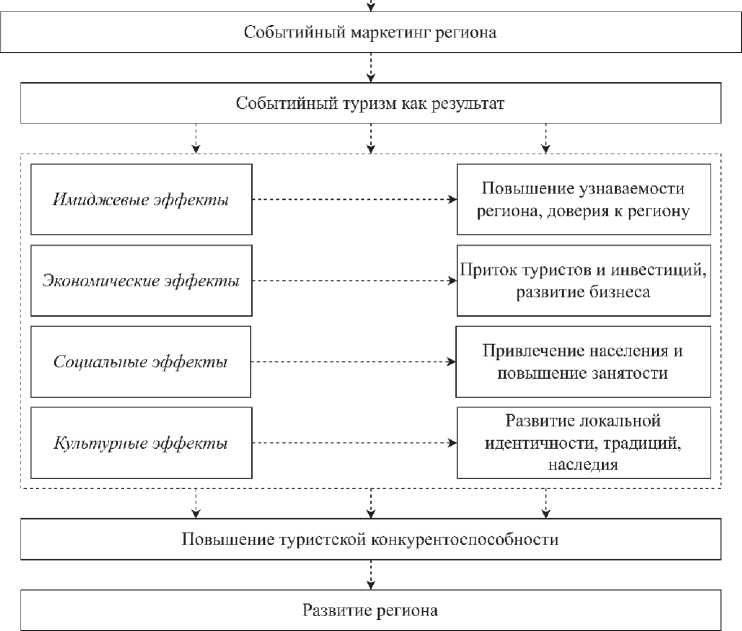 Событийный маркетинг является эффективным инструментом стратегического управления туристской конкурентоспособностью субъектов Российской Федерации, направленным на интеграцию экономических, имиджевых и социокульт урных факторов в единую систему развития территории. Применение событийного маркетинга в рамках региональной политики способствует повышению узнаваемости региона и формированию дополнительных источников регионального развития за счет стимулирования внутреннего и въездного туризма, участия населения, привлечения инвестиций и укрепления бренда региона.