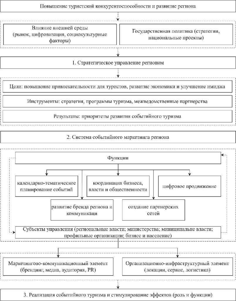 Причем роль и функции событийного туризма в стратегическом управлении туристской конкурентоспособностью субъекта Российской Федерации выражаются в виде многоуровневой структуры, включающей стратегический (национальные и региональные цели), тактический (маркетинг региона и событийный маркетинг); операционный уровень (событийный туризм и эффекты). Происходит интеграция государственных и частных акторов, и повышение туристской конкурентоспособности