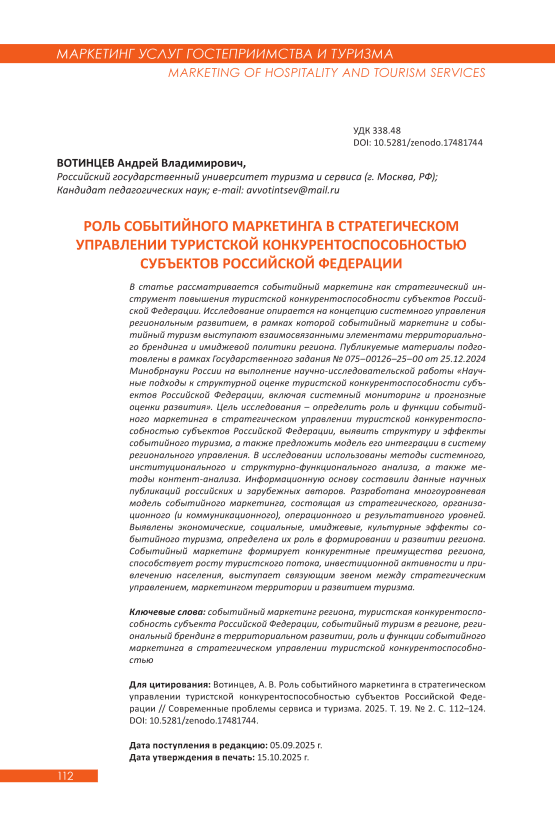 В статье рассматривается событийный маркетинг как стратегический инструмент повышения туристской конкурентоспособности субъектов Российской Федерации. Исследование опирается на концепцию системного управления региональным развитием, в рамках которой событийный маркетинг и событийный туризм выступают взаимосвязанными элементами территориального брендинга и имиджевой политики региона. Публикуемые материалы подготовлены в рамках Государственного задания № 075–00126–25–00 от 25.12.2024 Минобрнауки России на выполнение научноисследовательской работы «Научные подходы к структурной оценке туристской конкурентоспособности субъектов Российской Федерации, включая системный мониторинг и прогнозные оценки развития». Цель исследования – определить роль и функции событийного маркетинга в стратегическом управлении туристской конкурентоспособностью субъектов Российской Федерации, выявить структуру и эффекты событийного туризма, а также предложить модель его интеграции в систему регионального управления. В исследовании использованы методы системного, институционального и структурнофункционального анализа, а также методы контентанализа. Информационную основу составили данные научных публикаций российских и зарубежных авторов. Разработана многоуровневая модель событийного маркетинга, состоящая из стратегического, организационного (и коммуникационного), операционного и результативного уровней. Выявлены экономические, социальные, имиджевые, культурные эффекты событийного туризма, определена их роль в формировании и развитии региона. Событийный маркетинг формирует конкурентные преимущества региона, способствует росту туристского потока, инвестиционной активности и привлечению населения, выступает связующим звеном между стратегическим управлением, маркетингом территории и развитием туризма.