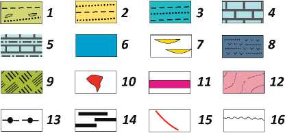 1 — continental glacial, deltaic, and near-shore marine deposits; 2 — dominantly near-shore marine and alluvial sands; 3 — mud-dominated shallow shelf deposits; 4 — marine carbonate deposits; 5 — interbedding of carbonates and clastics; 6 — shales of intrashelf troughs; 7 — evaporates: 8 — granite intrusions, 9 — trap basalts; 10 — metamorphic rocks; 11 — bituminous shales; 12 — coal; 13 — incised river valley deposits; 14 — volcanoclastic deposits; 15 — fault; 16 — unconformity