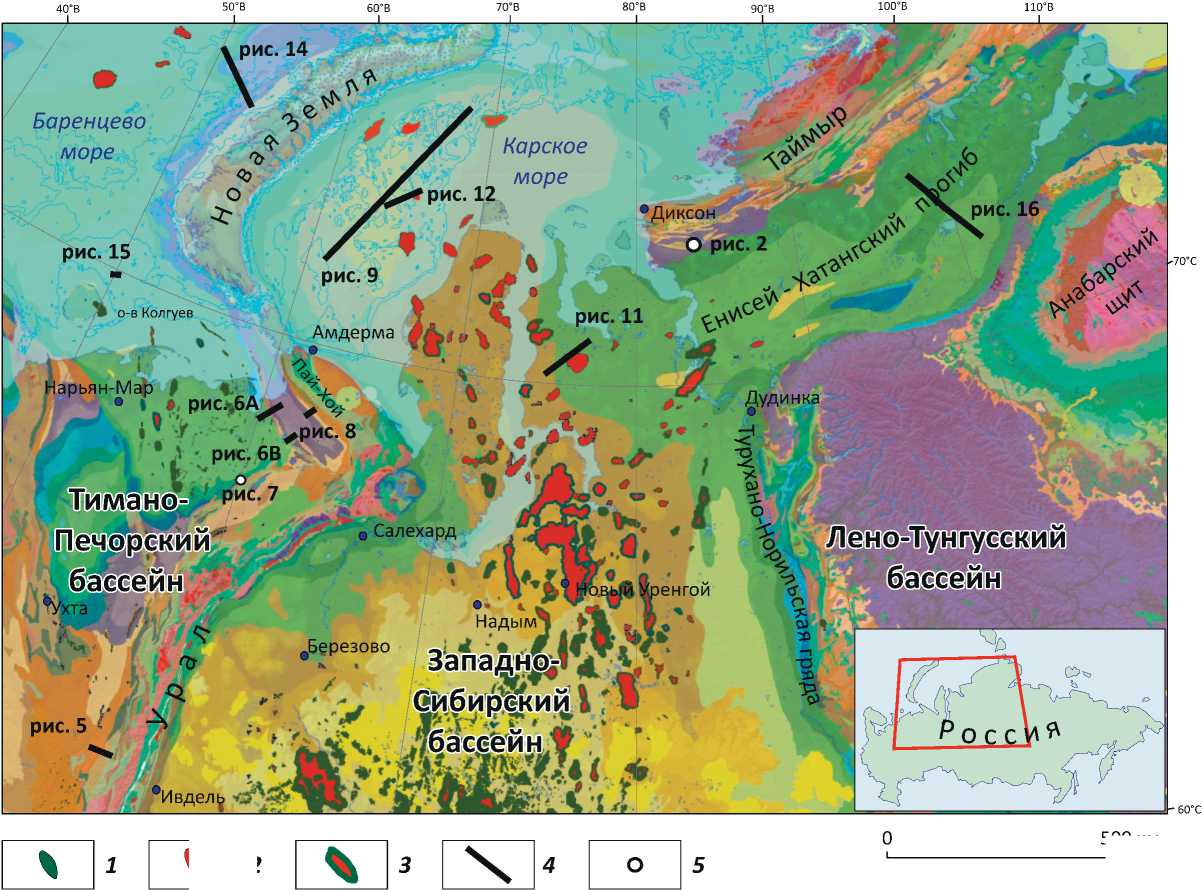 Орогенические пояса Северного Урала, Пай-Хоя, Новой Земли и п-ова Таймыр образуют складчатую систему сложной конфигурации, которая граничит c Западно-Сибирским, Енисей-Хатангским, Тимано-Печорским и Баренцевоморским бассейна- ми (рис. 1). С этими бассейнами связаны основные нефтегазовые ресурсы Арктической Евразии ([1] и др.).