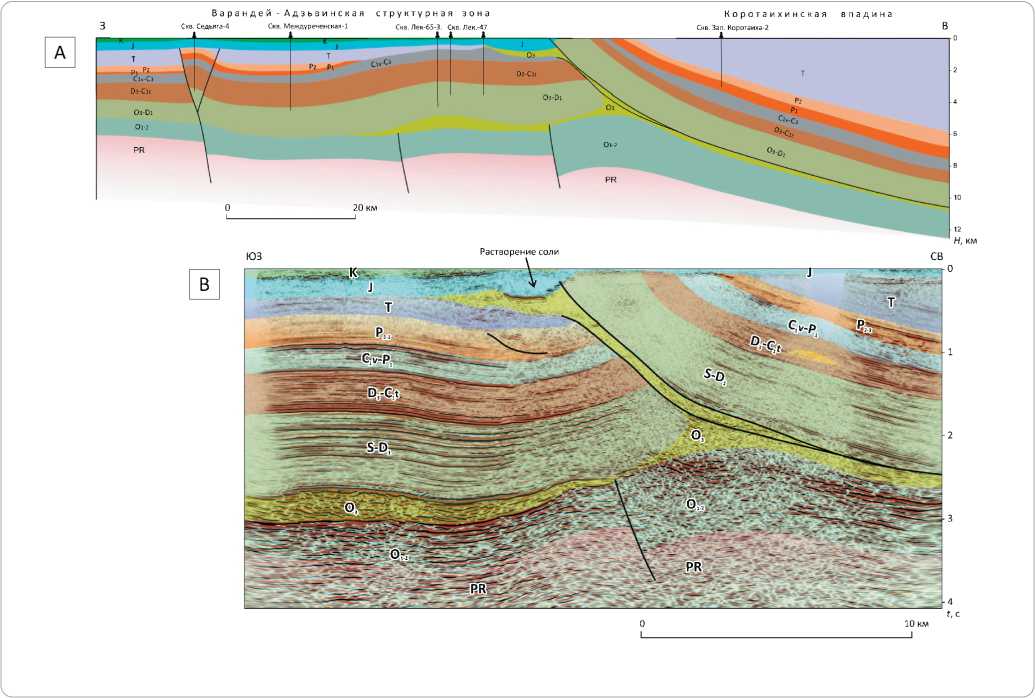 Наличие дислоцированных солей на западном борту Коротаихинской впадины иллюстрируют геологический и сейсмический разрезы на рис. 6. Эти разрезы пересекают зону Талотинского надвига, по которому Коротаихинская впадина сочленяется с платформенной частью Тимано-Печорского бассейна.